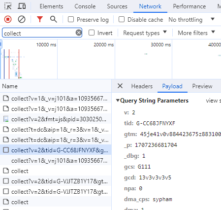 Analyze the Requests: Look through the list of filtered requests. Each item represents a data collection request sent to Google Analytics. Multiple entries might indicate that your site is using multiple Google Analytics properties or sending various types of events.