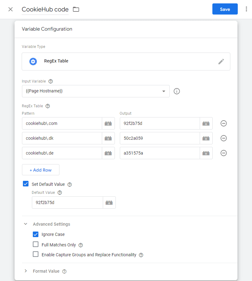 Follow these steps to create a RegEx Table variable, detecting the domain name and populating the CookieHub domain code accordingly: