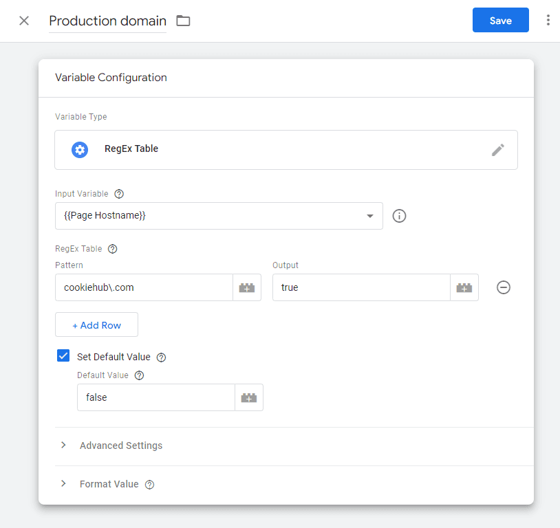 - In the RegEx Table, add a row and specify the production domain (e.g., cookiehub.com). Please note that special characters need to be escaped so put a backward slash in front of dots.