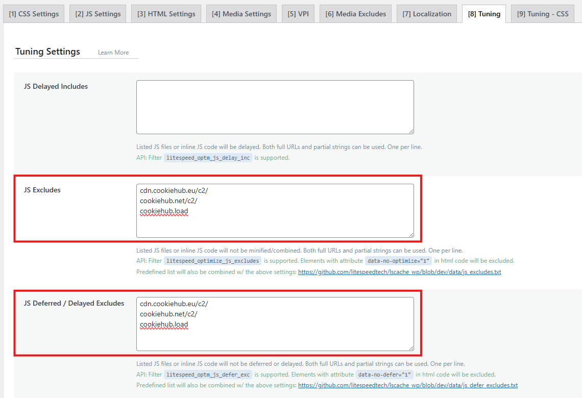 - Exclude CookieHub JavaScript from LiteSpeed’s cache: In the Optimization page, open the Tuning tab and find the JS Excludes and Load JS Deferred sections, which are used to exclude specific JavaScript files and scripts from caching.