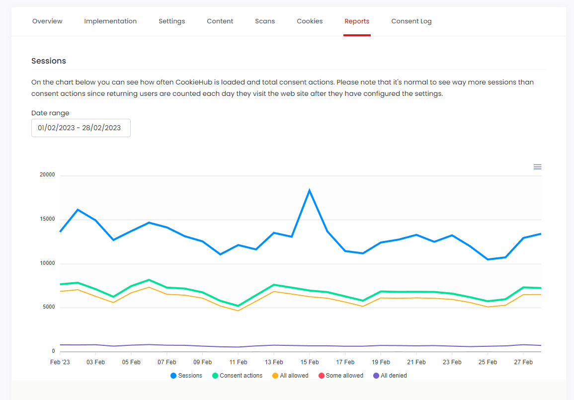 The Reports tab provides an overview of your website’s cookie usage and user consent actions. The following reports types are available: