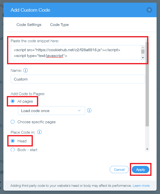 - Paste the CookieHub implementation code into the first field, making sure that it is added to All pages and placed in the Head section.